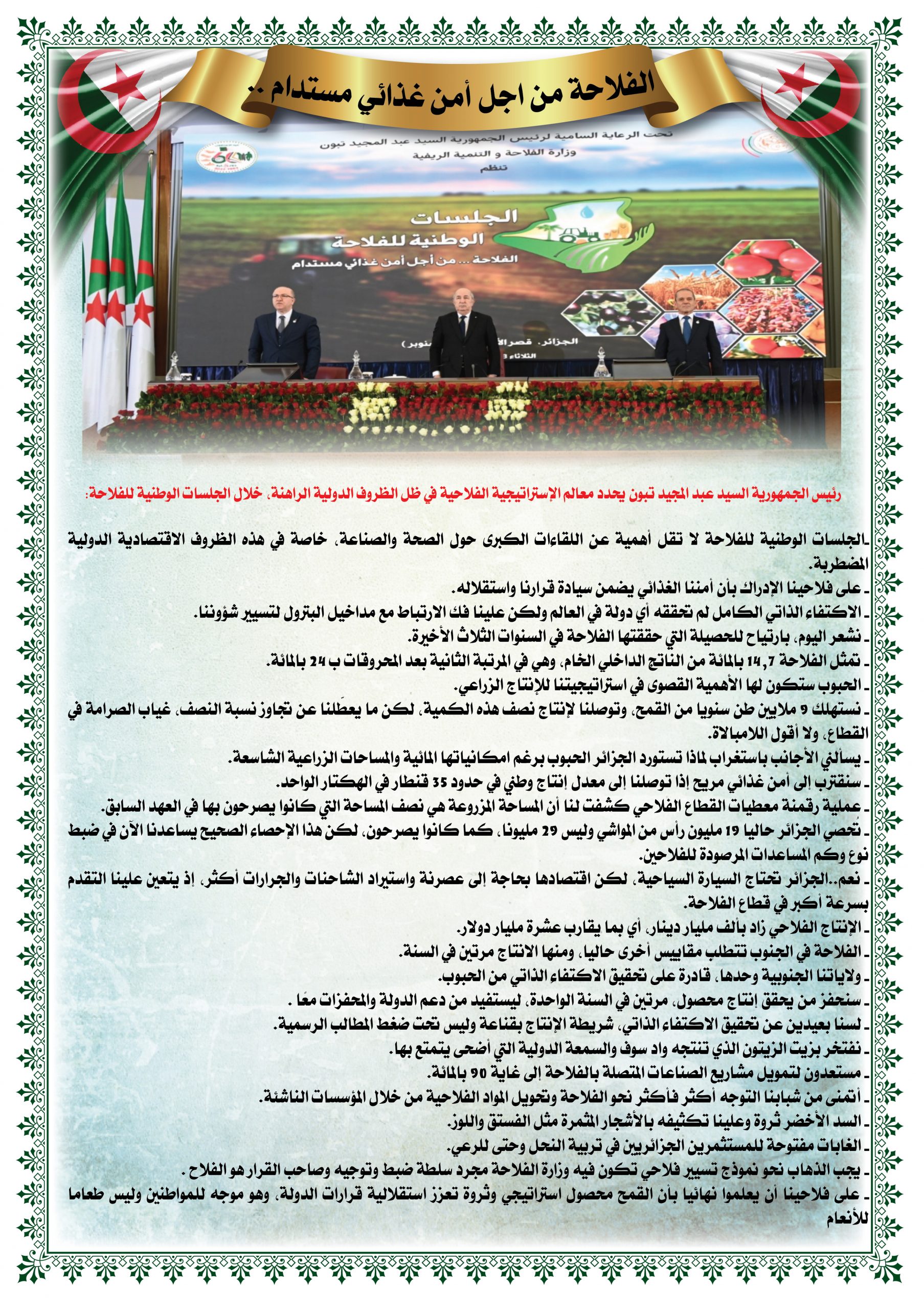 وذلك بتاريخ 03 مارس 2023، حيث يهدف هذا المعرض إلى تعزيز الوعي بالتاريخ الفلاحي ، وتجلت أهم محاوره ابتداء من العهد العثماني الذي اهتم بتوثيق عقود الملكية الفلاحية بصيغة الوقف أو الحبوس، ثم الفترة الاستعمارية التي تم فيها استنزاف خيرات الجزائر الفلاحية مرورا بتأميم الأراضي المغتصبة ووضعية الفلاحين الجزائريين عشية بعد استرجاع السيادة الوطنية، وكذا التعاون الجزائري الخارجي من اجل الابتكار والتطوير في مجال الفلاحة، وصولا إلى مساعي الجزائر الحثيثة في جعل قطاع الفلاحة محور أساس الاقتصاد الجديد.
