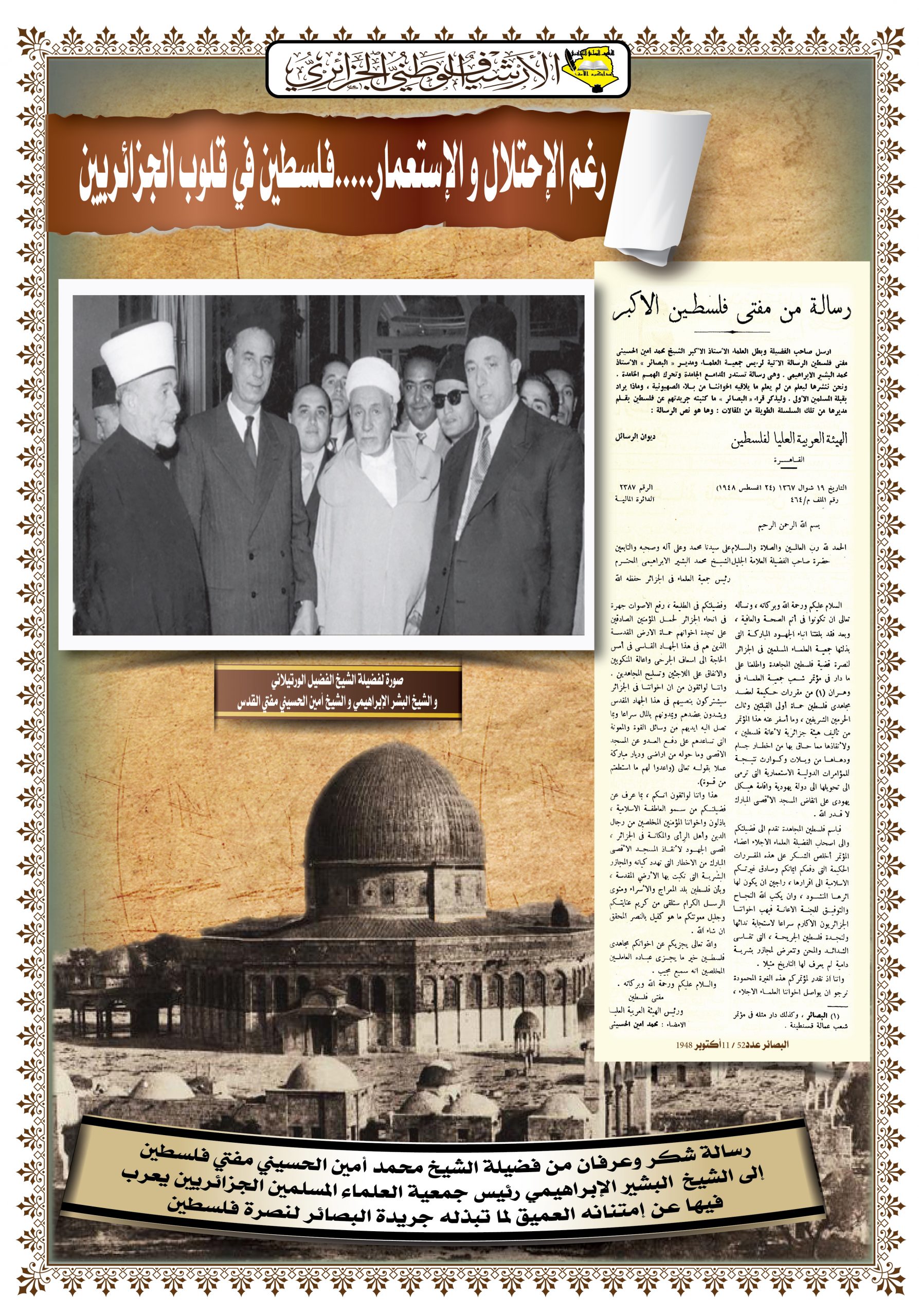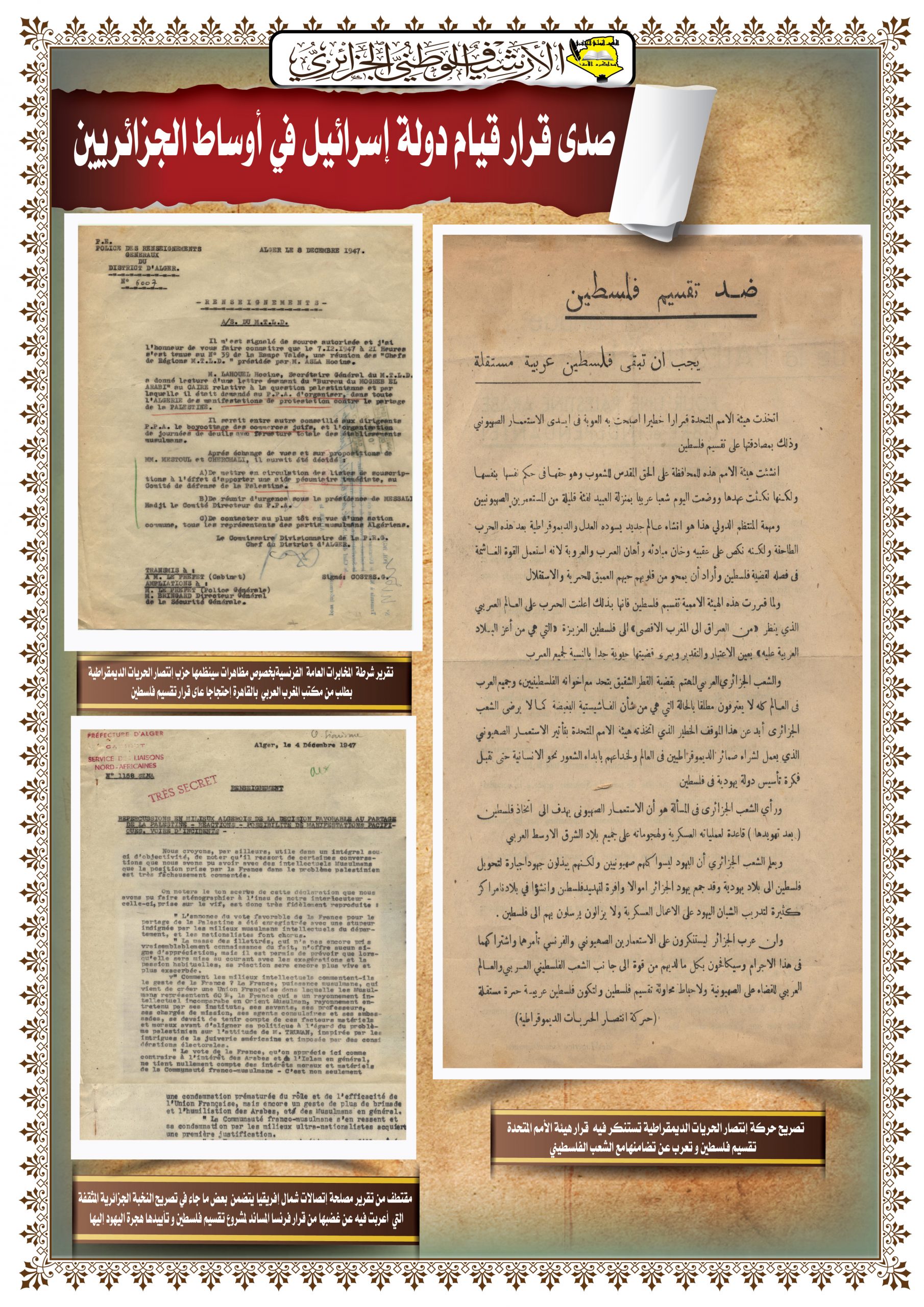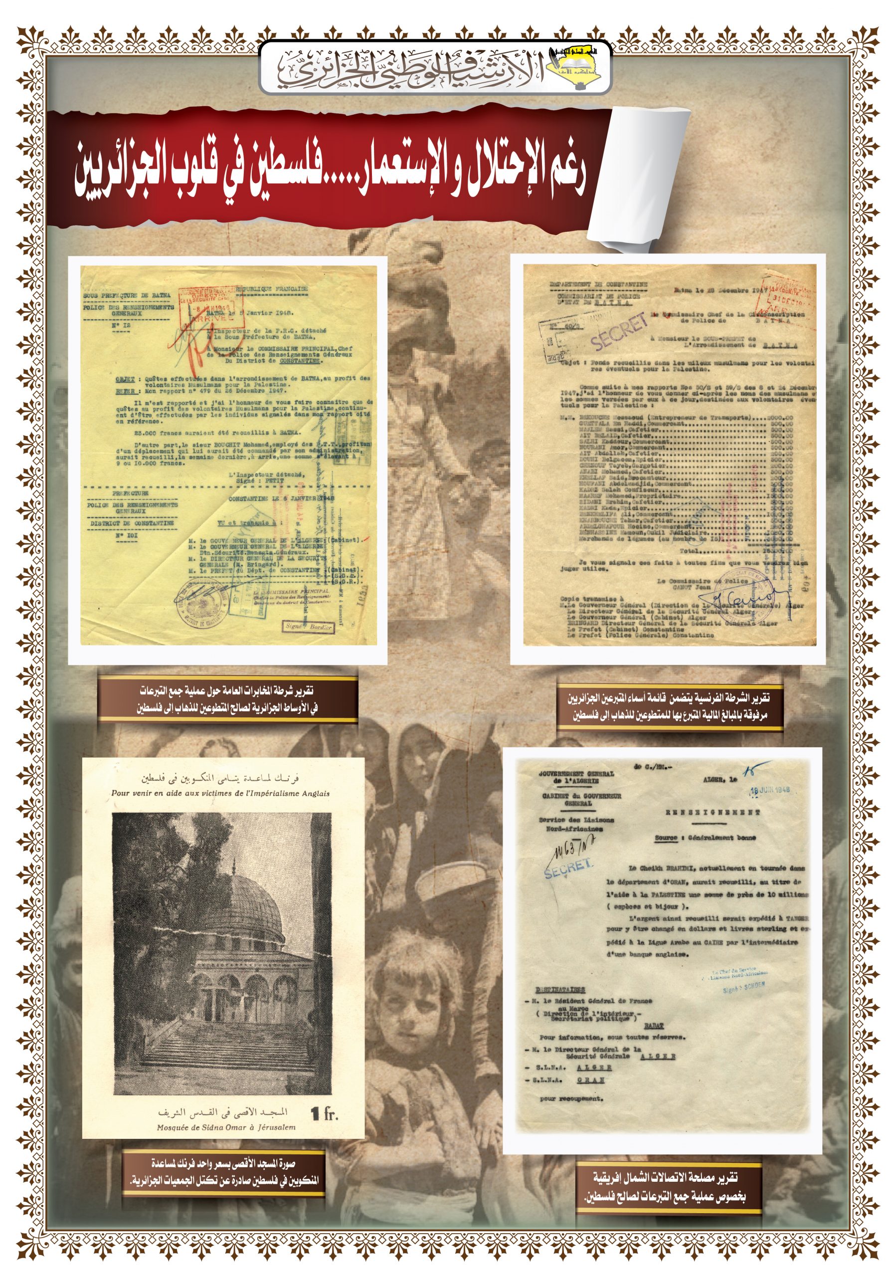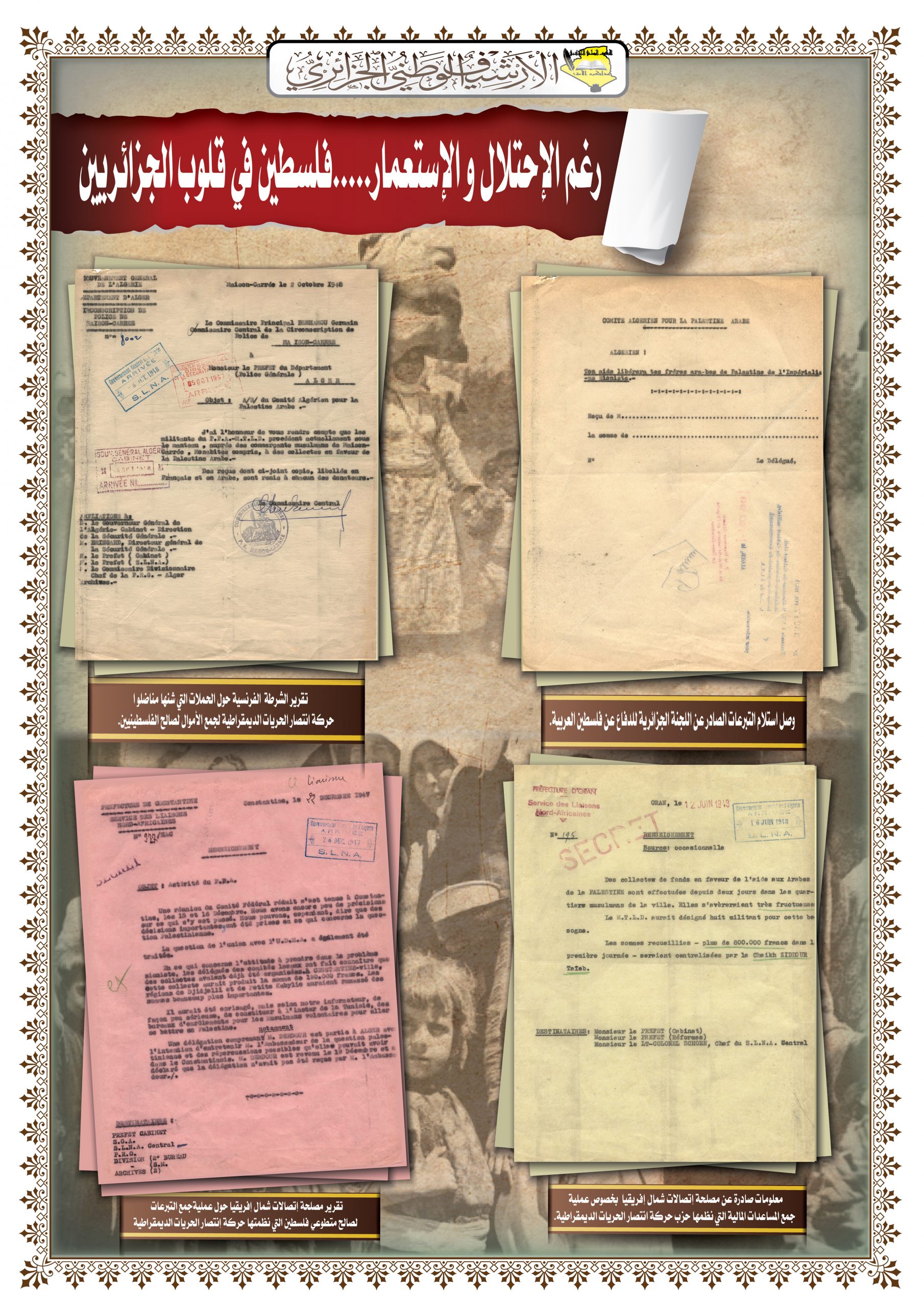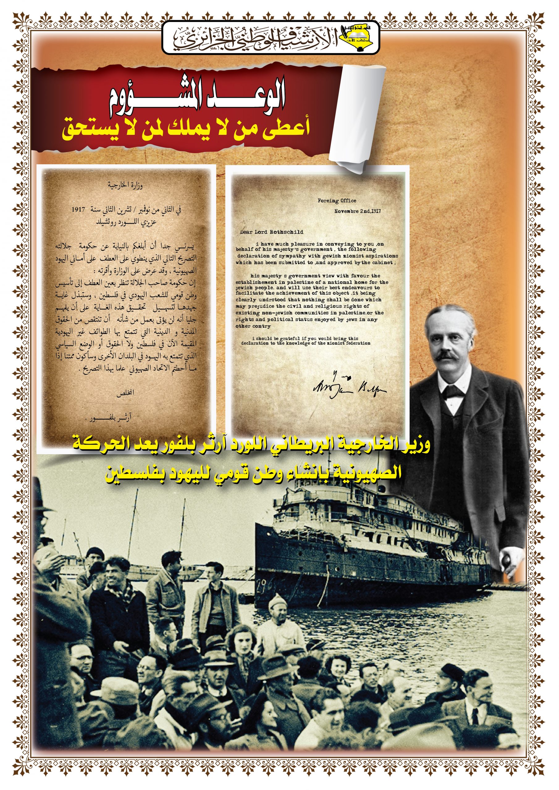 بحكم الانتماء العربي و الإسلامي تعتبر القضية الفلسطينية القضية الجوهرية للجزائر و الجزائريين، وفي هذا الإطار وبتاريخ أكتوبر 2017 قامت مؤسسة الأرشيف الوطني بإعداد معرض حول وعد بلفور الصادر عن الحكومة البريطانية في 02 نوفمبر 1917 من طرف آرثر جيمس بلفور والذي تم فيه الإعلان عن الوطن القومي للشعب اليهودي في فلسطين …. فهو وعد تم فيه إعطاء من لايملك لمن ليس له الحق. كما قام المعرض بإبراز مواقف الجزائريين من هذا الوعد المشؤوم رغم وطأة الاحتلال والاستعمار.