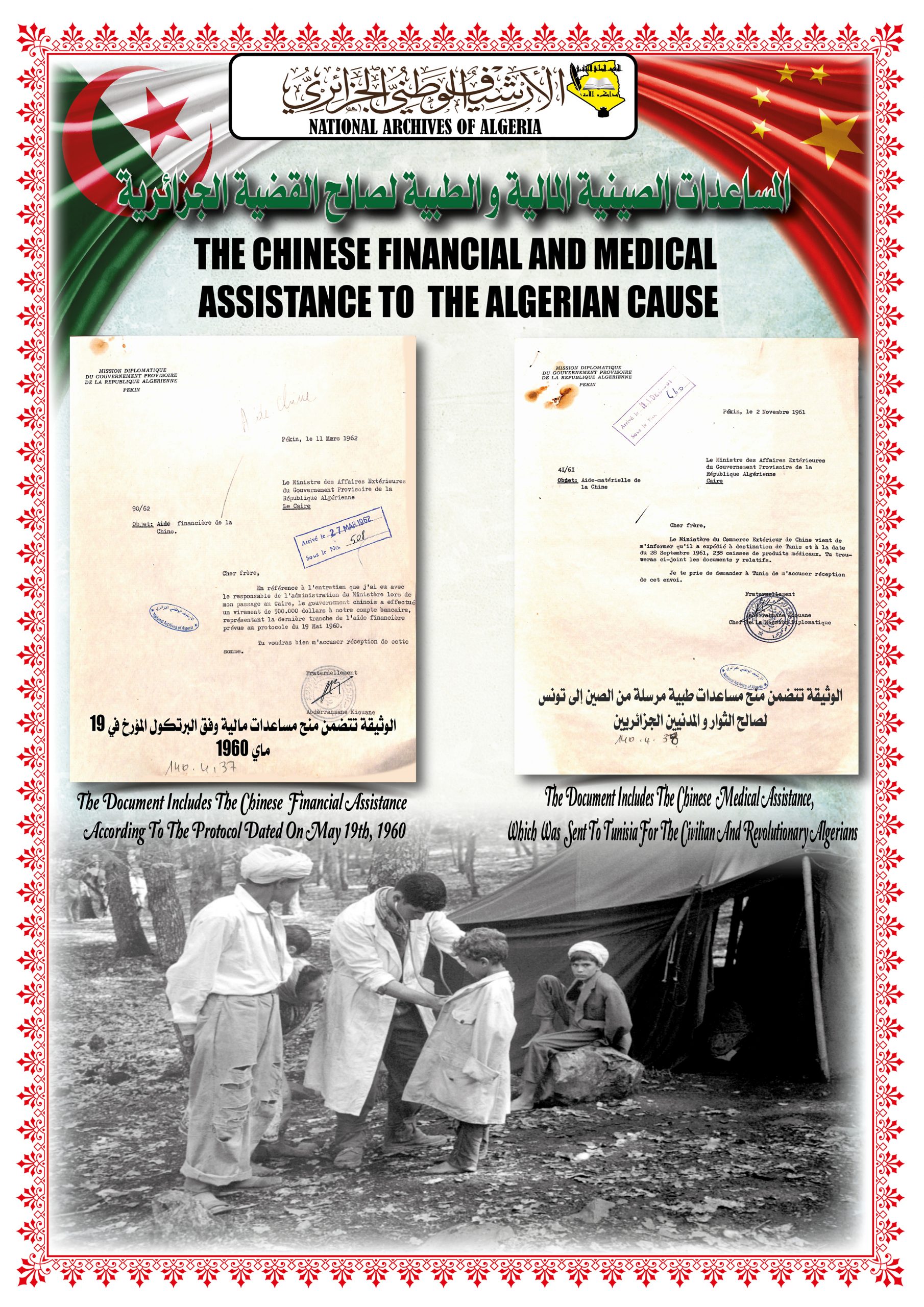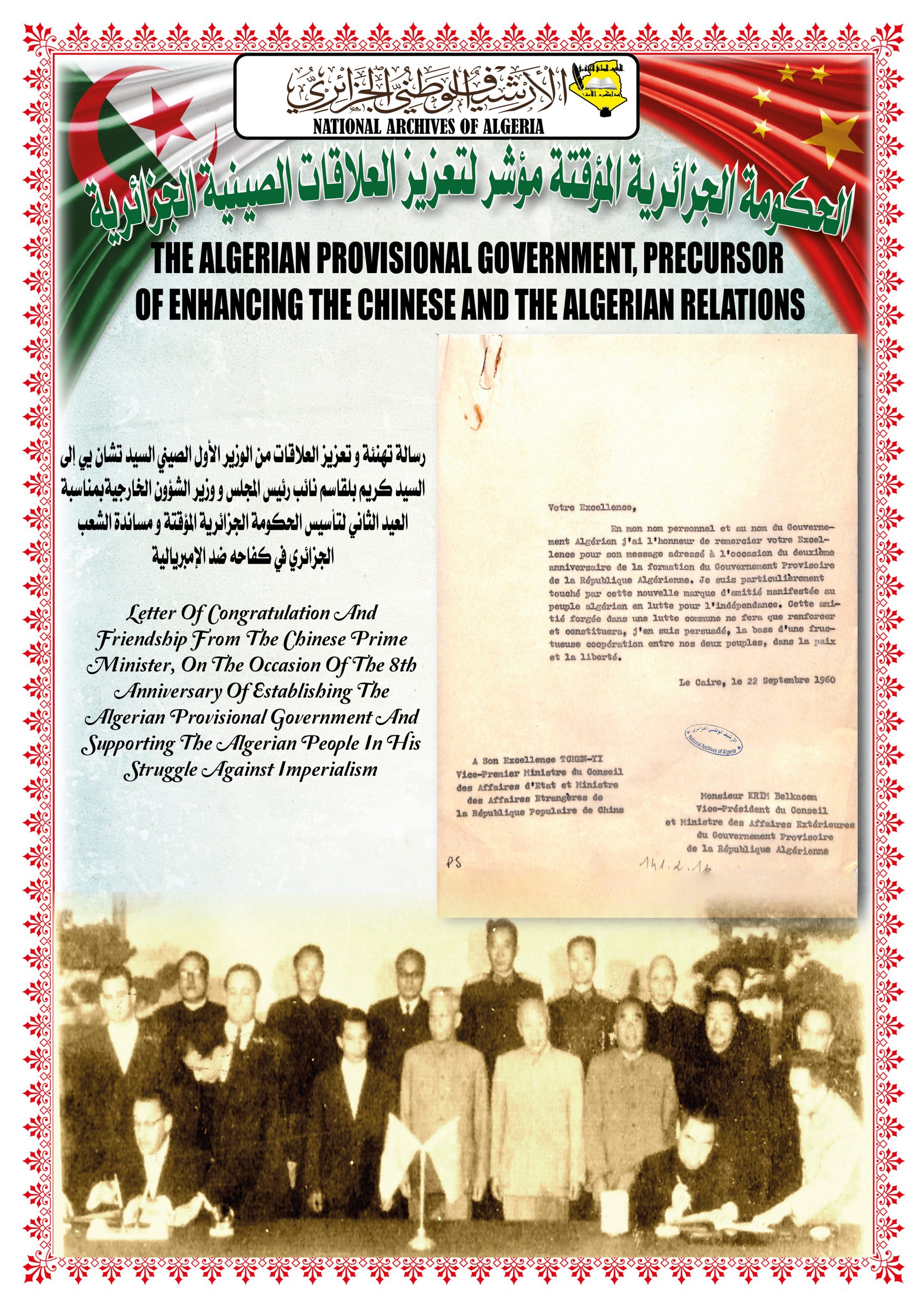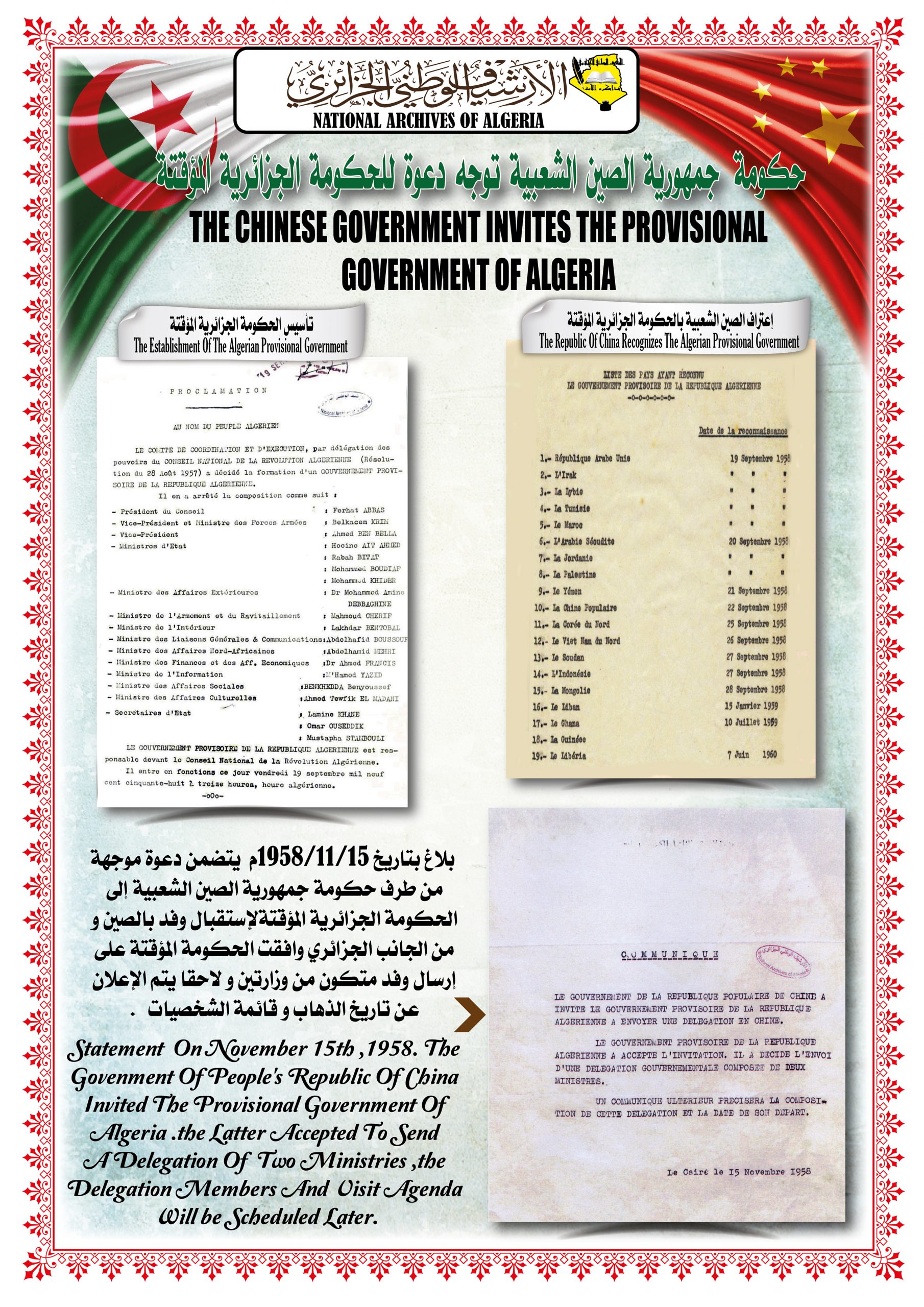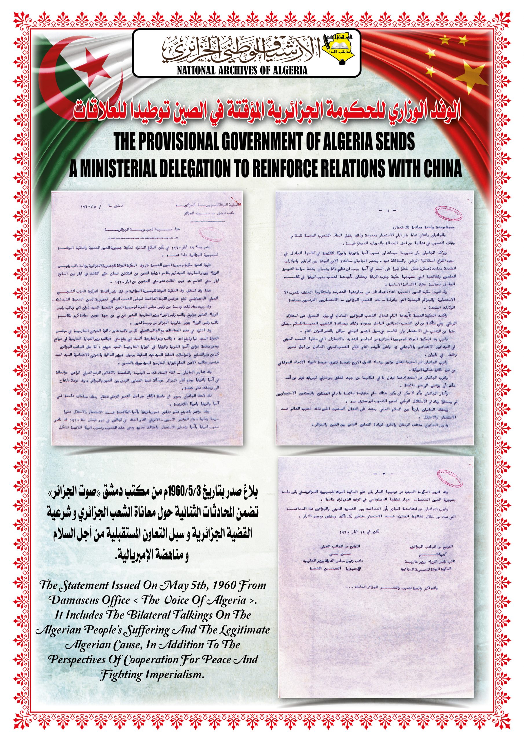 بهذه المناسبة، ألقــى السيد مدير مركز المحفوظات الوطنية كلمة ترحيبية أشاد من خلالها بدور جمهورية الصين الشعبية في دعمها للجزائر خلال ثورتها التحريرية وكذا إعترافها بالحكومة المؤقتة وتهنئتها بإسترجاع سيادتها الوطنية، كما أبرز موقف الجزائر إتجاه جمهورية الصين الشعبية ودعمها لها في الحفاظ على مكانتها الدولية.