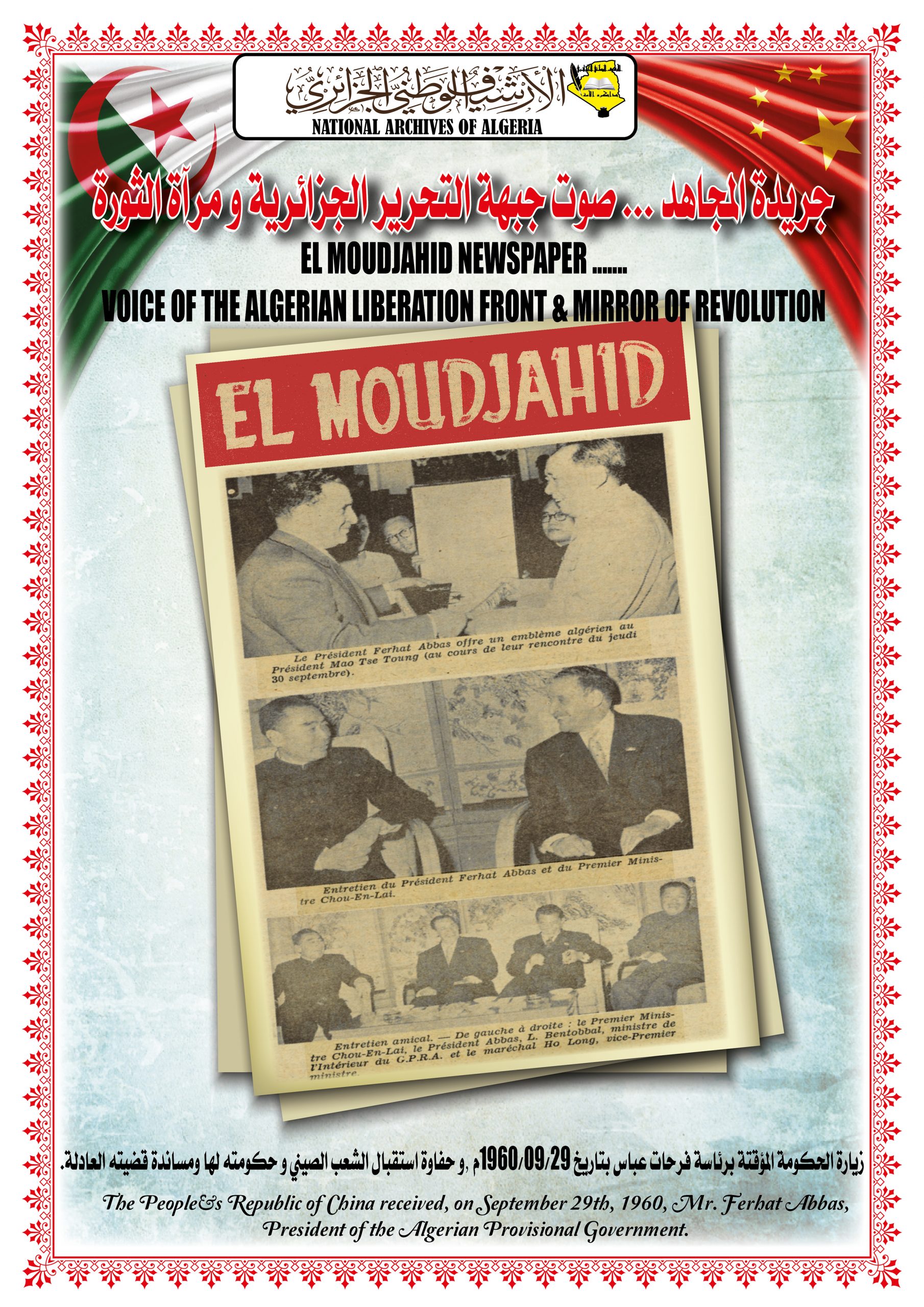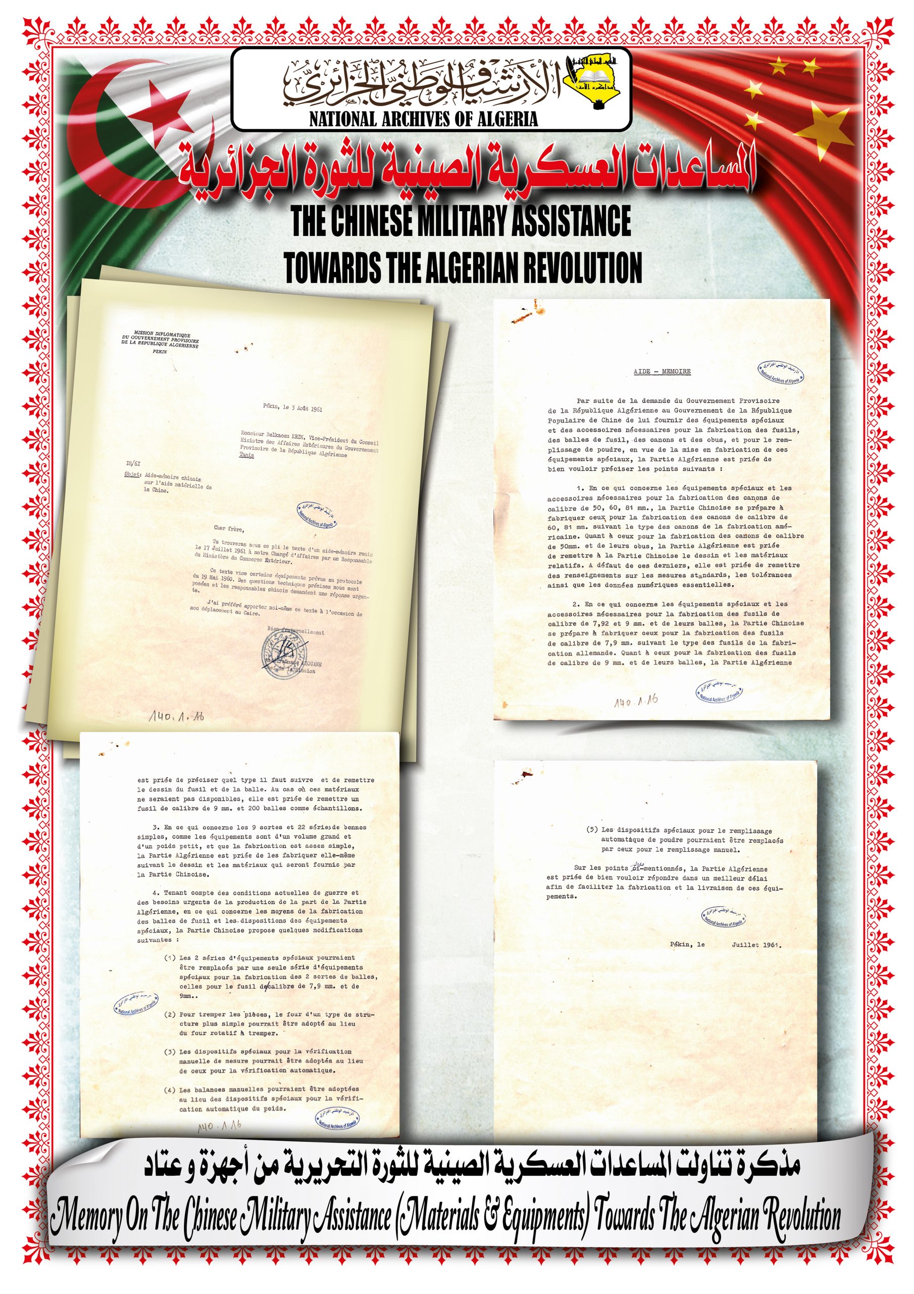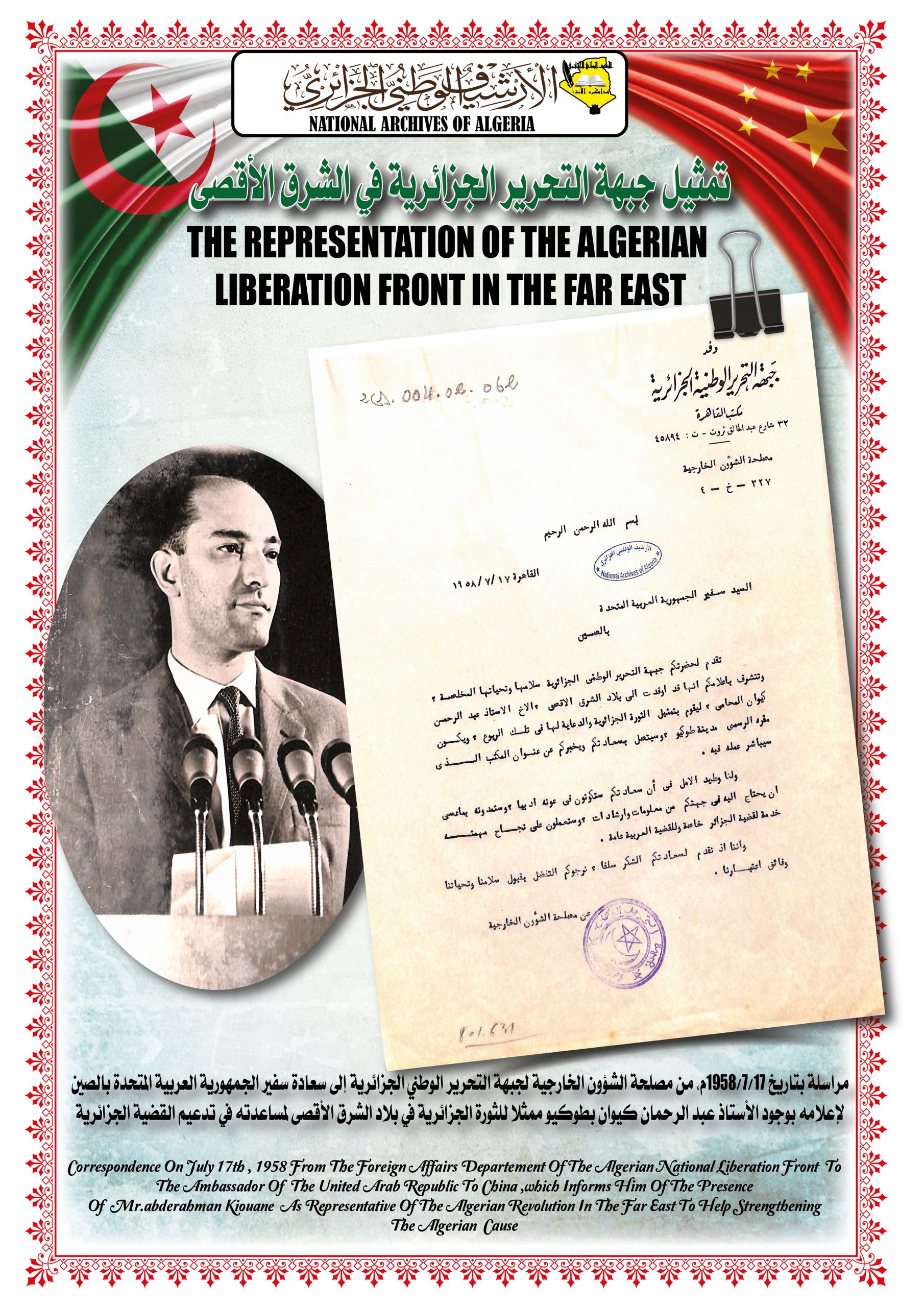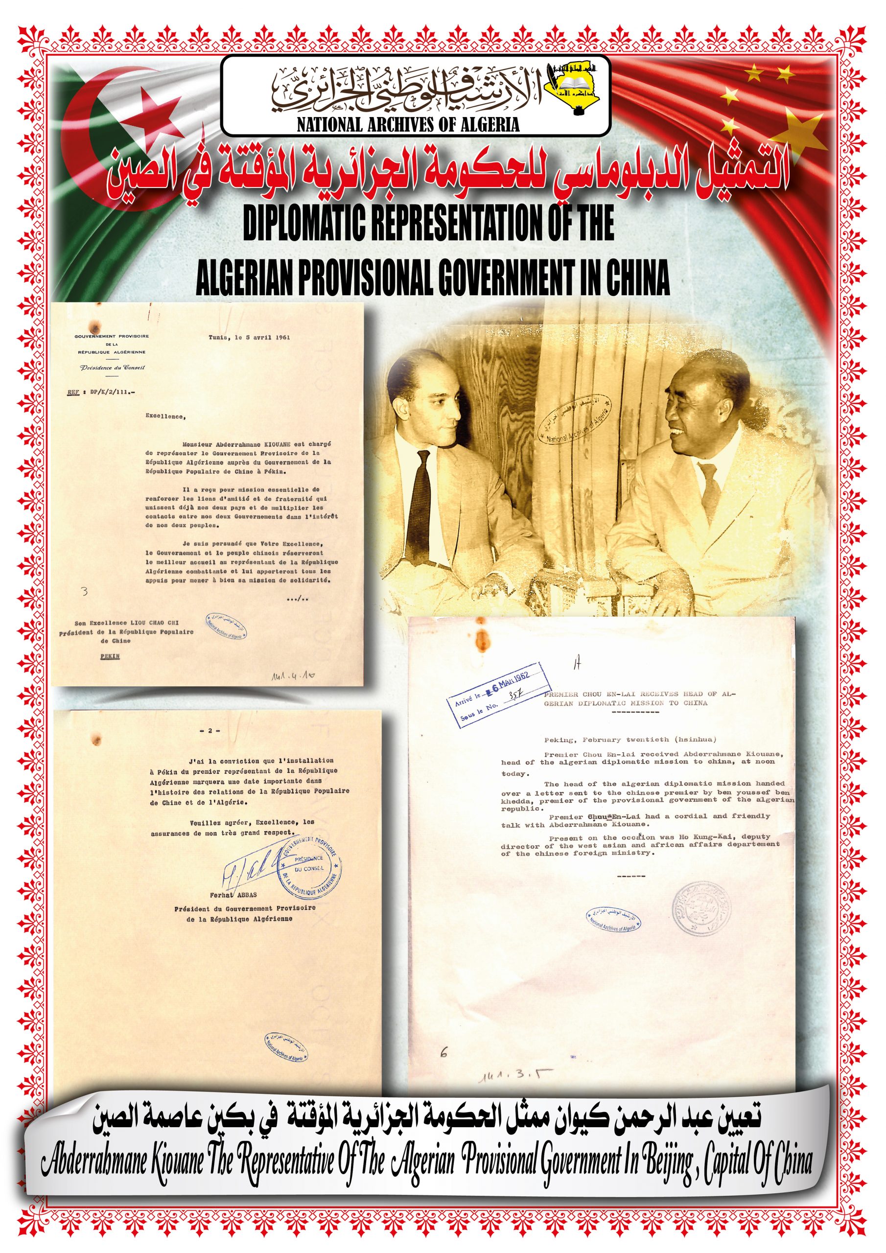 بهذه المناسبة، ألقــى السيد مدير مركز المحفوظات الوطنية كلمة ترحيبية أشاد من خلالها بدور جمهورية الصين الشعبية في دعمها للجزائر خلال ثورتها التحريرية وكذا إعترافها بالحكومة المؤقتة وتهنئتها بإسترجاع سيادتها الوطنية، كما أبرز موقف الجزائر إتجاه جمهورية الصين الشعبية ودعمها لها في الحفاظ على مكانتها الدولية.
