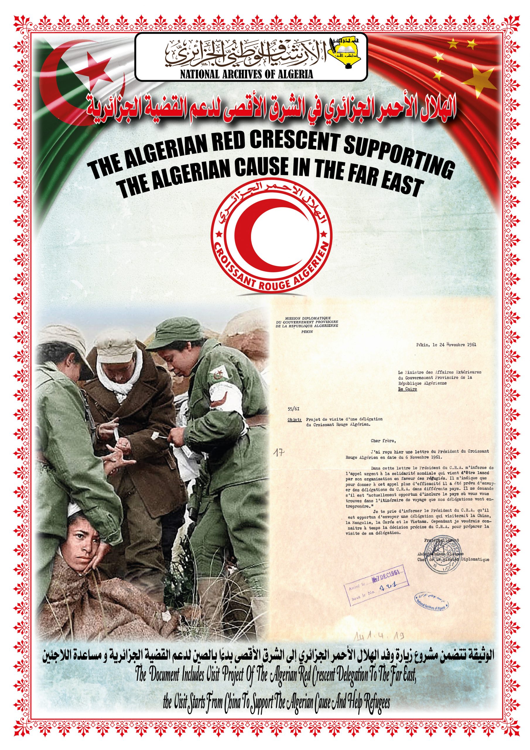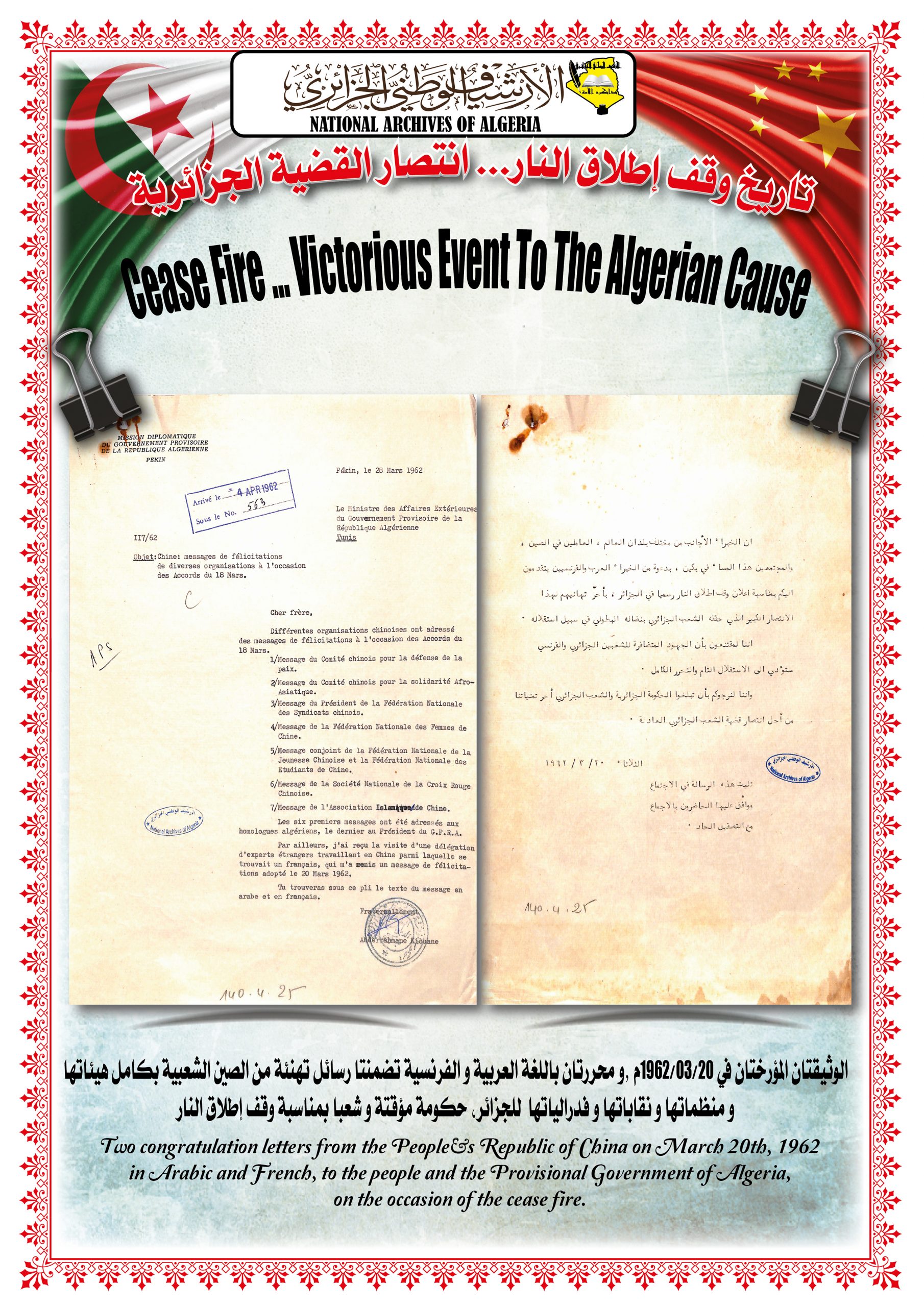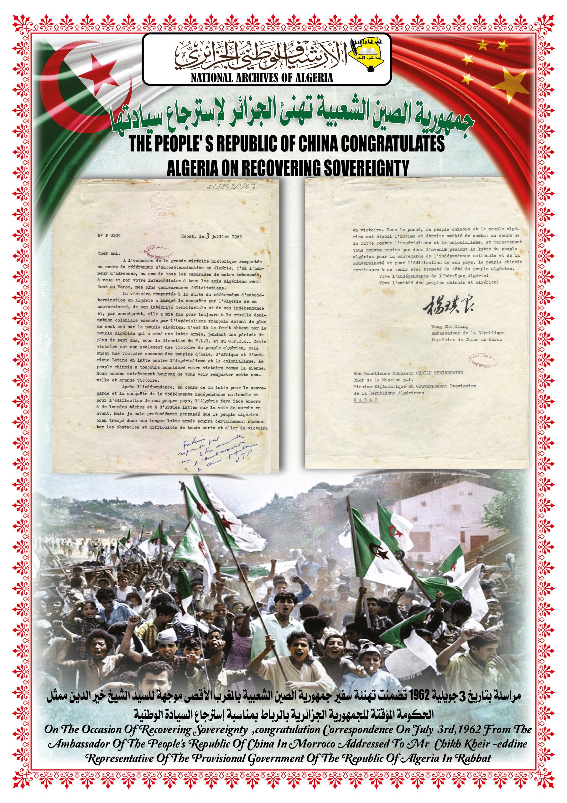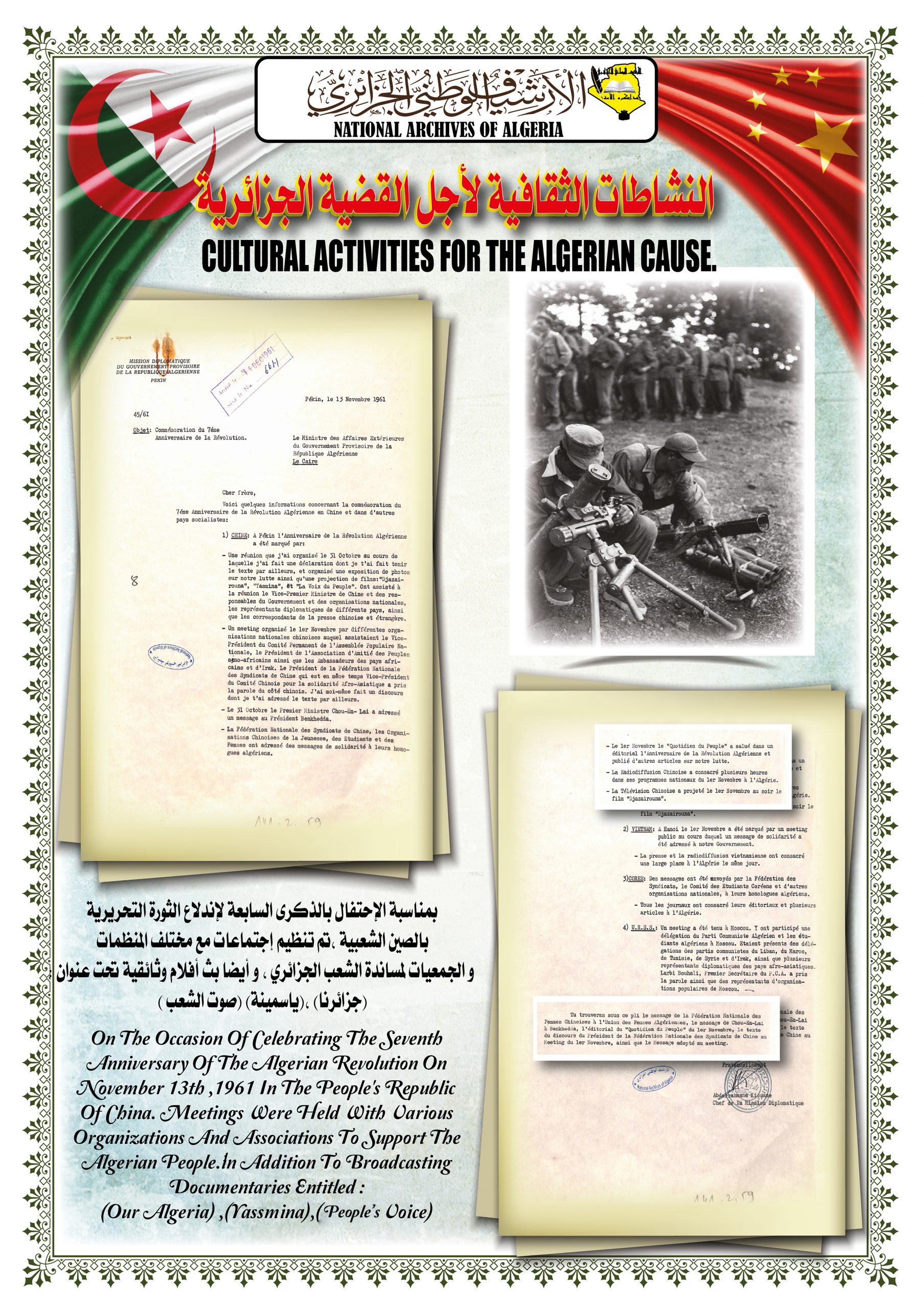 بهذه المناسبة، ألقــى السيد مدير مركز المحفوظات الوطنية كلمة ترحيبية أشاد من خلالها بدور جمهورية الصين الشعبية في دعمها للجزائر خلال ثورتها التحريرية وكذا إعترافها بالحكومة المؤقتة وتهنئتها بإسترجاع سيادتها الوطنية، كما أبرز موقف الجزائر إتجاه جمهورية الصين الشعبية ودعمها لها في الحفاظ على مكانتها الدولية.