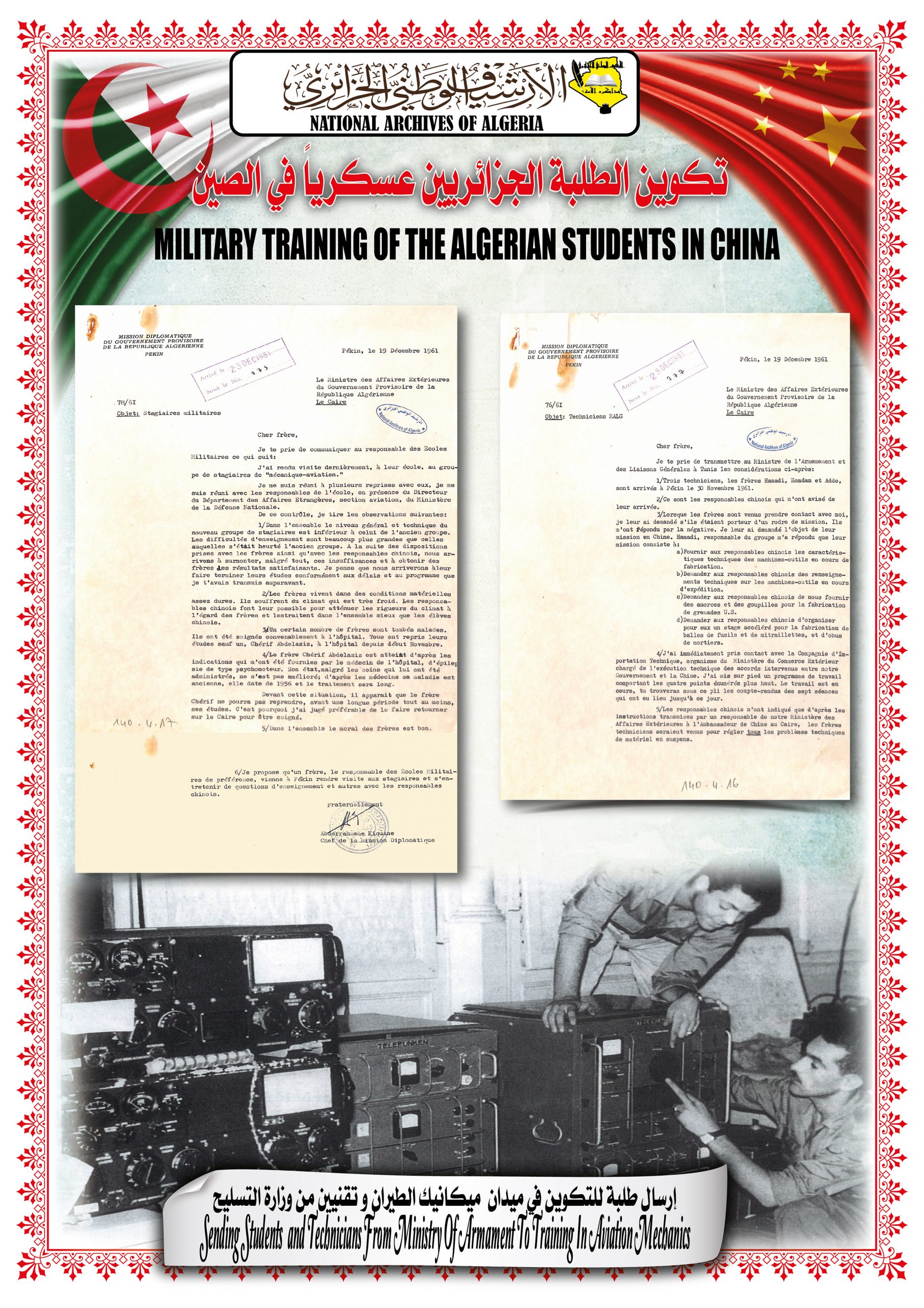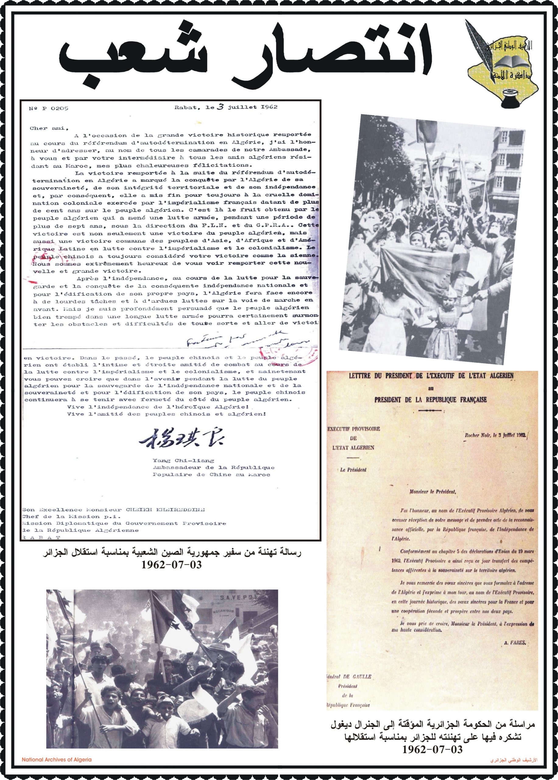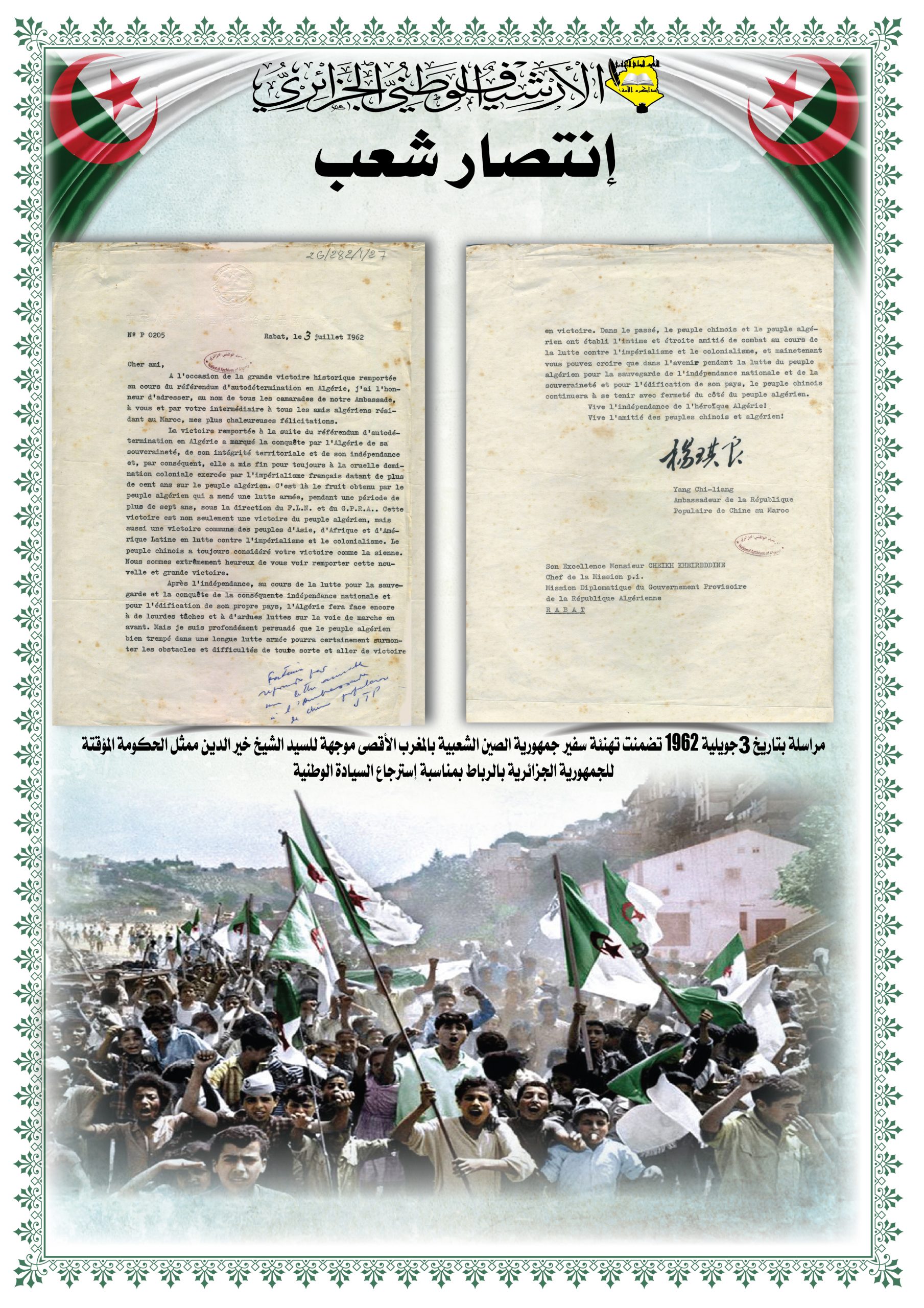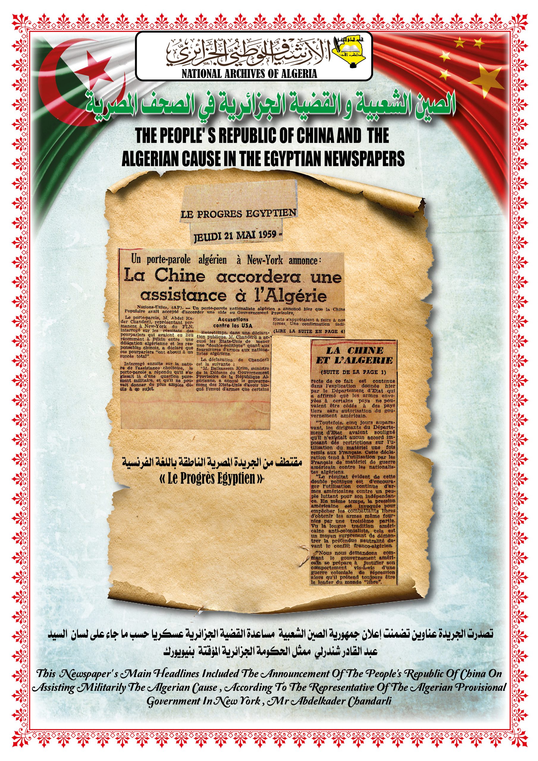 بهذه المناسبة، ألقــى السيد مدير مركز المحفوظات الوطنية كلمة ترحيبية أشاد من خلالها بدور جمهورية الصين الشعبية في دعمها للجزائر خلال ثورتها التحريرية وكذا إعترافها بالحكومة المؤقتة وتهنئتها بإسترجاع سيادتها الوطنية، كما أبرز موقف الجزائر إتجاه جمهورية الصين الشعبية ودعمها لها في الحفاظ على مكانتها الدولية.