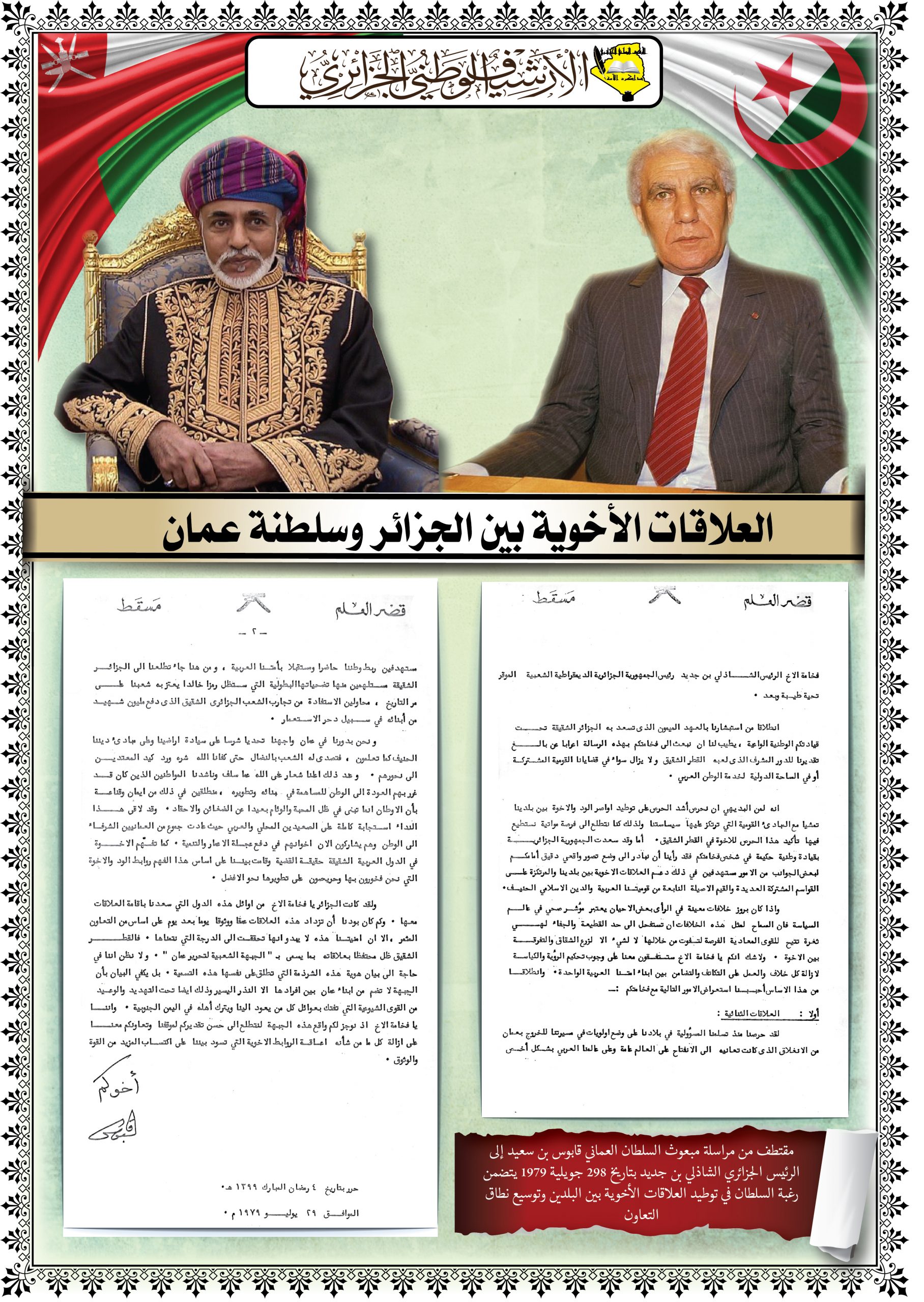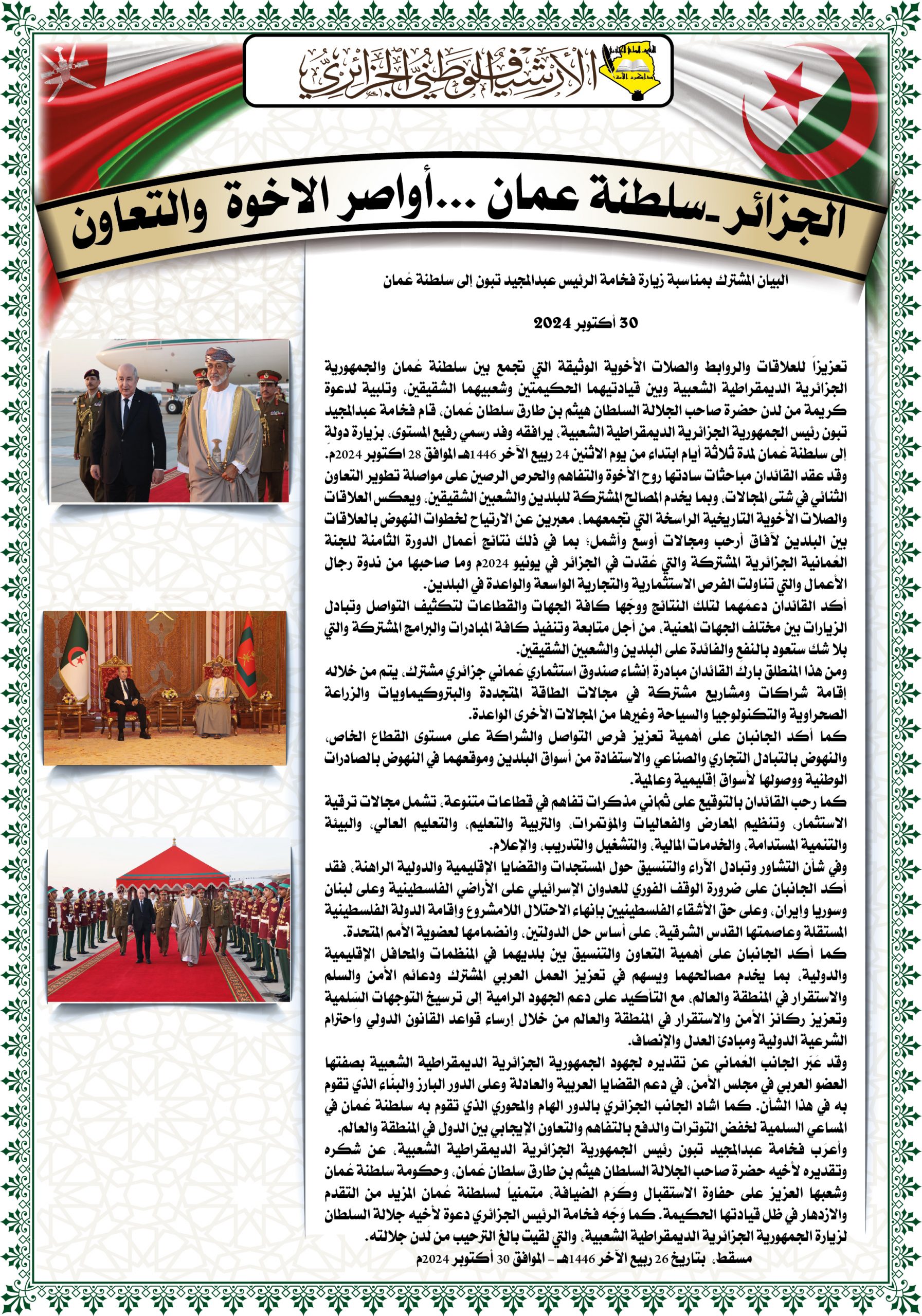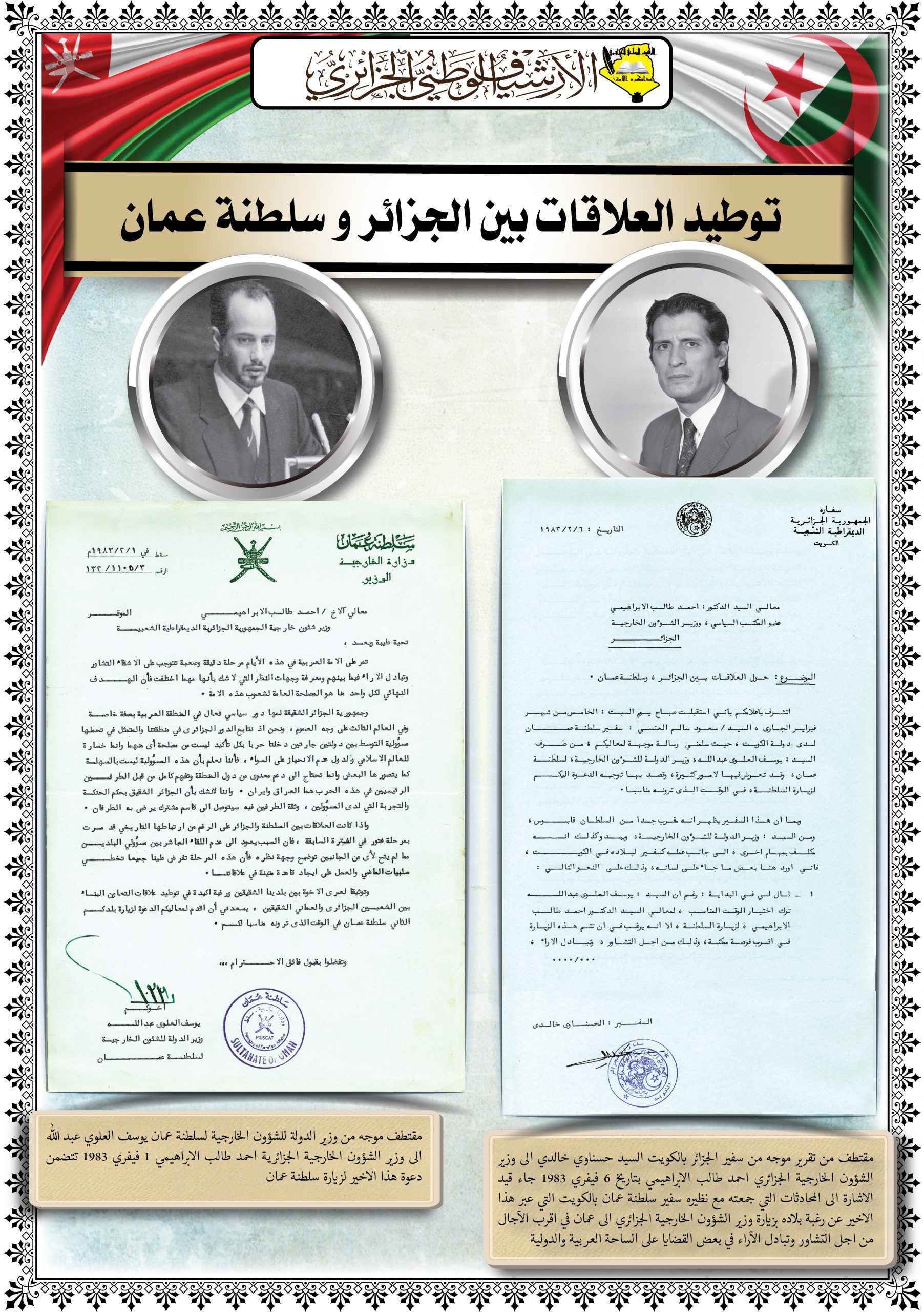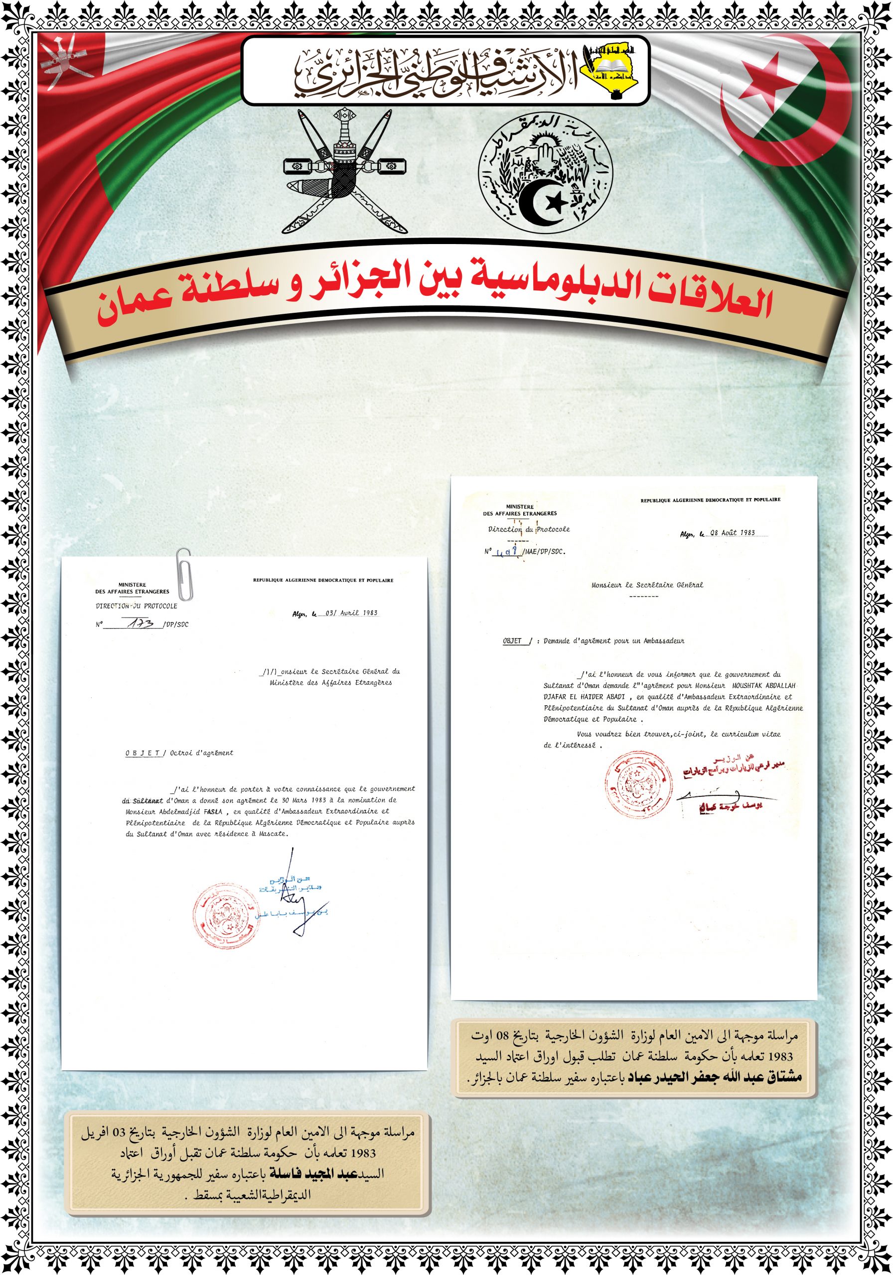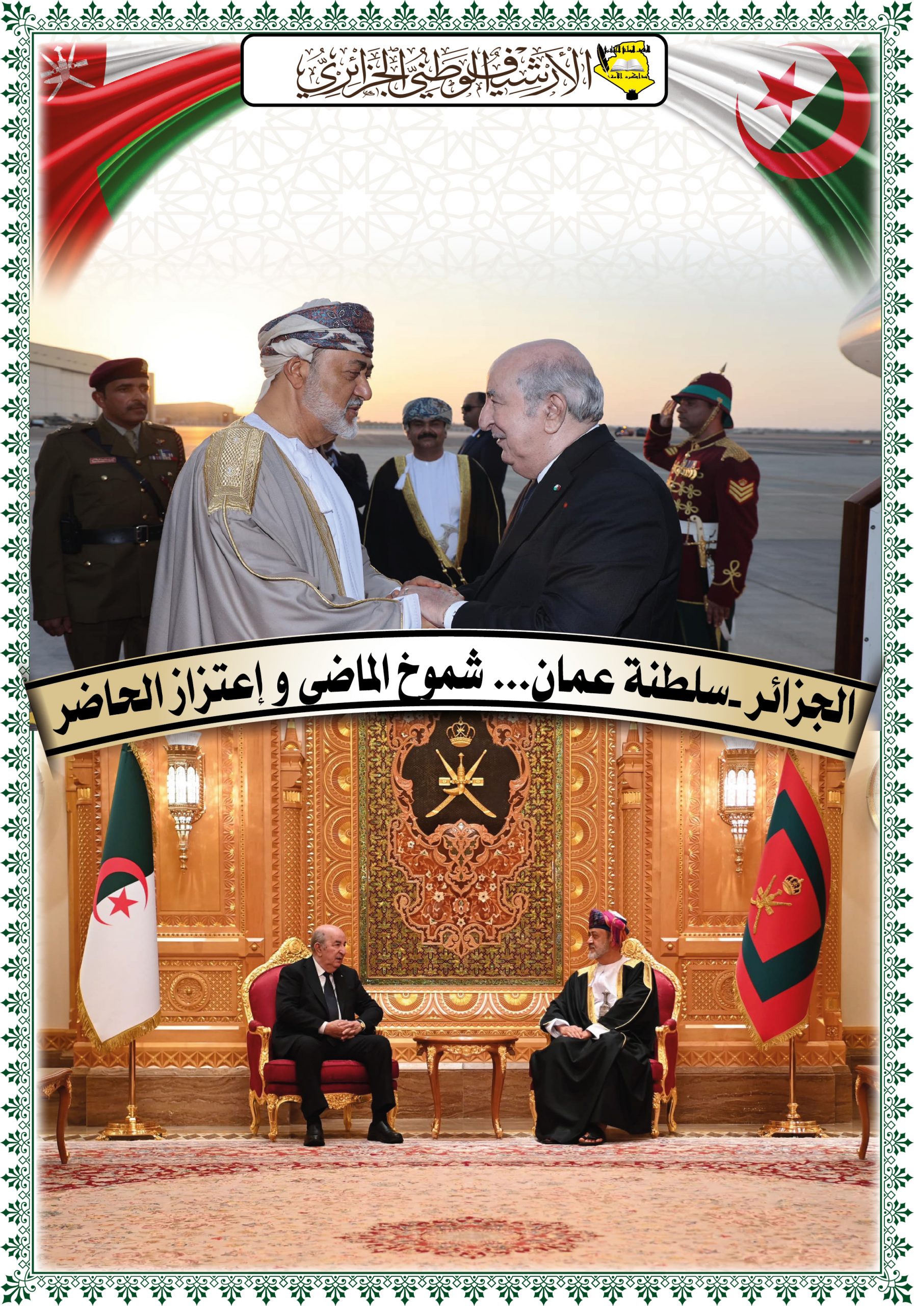 تخلل الزيارة تنظيم معرض على مستوى مركز المحفوظات الوطنية تضمن العلاقات الأخوية بين البلدين بعنوان” الجزائر – سلطنة عمان…شموخ الماضي واعتزاز بالحاضر “ و عرضا تقديميا حول الموقع الالكتروني للمركز وكذا زيارة ميدانية لمختلف أقسامه.