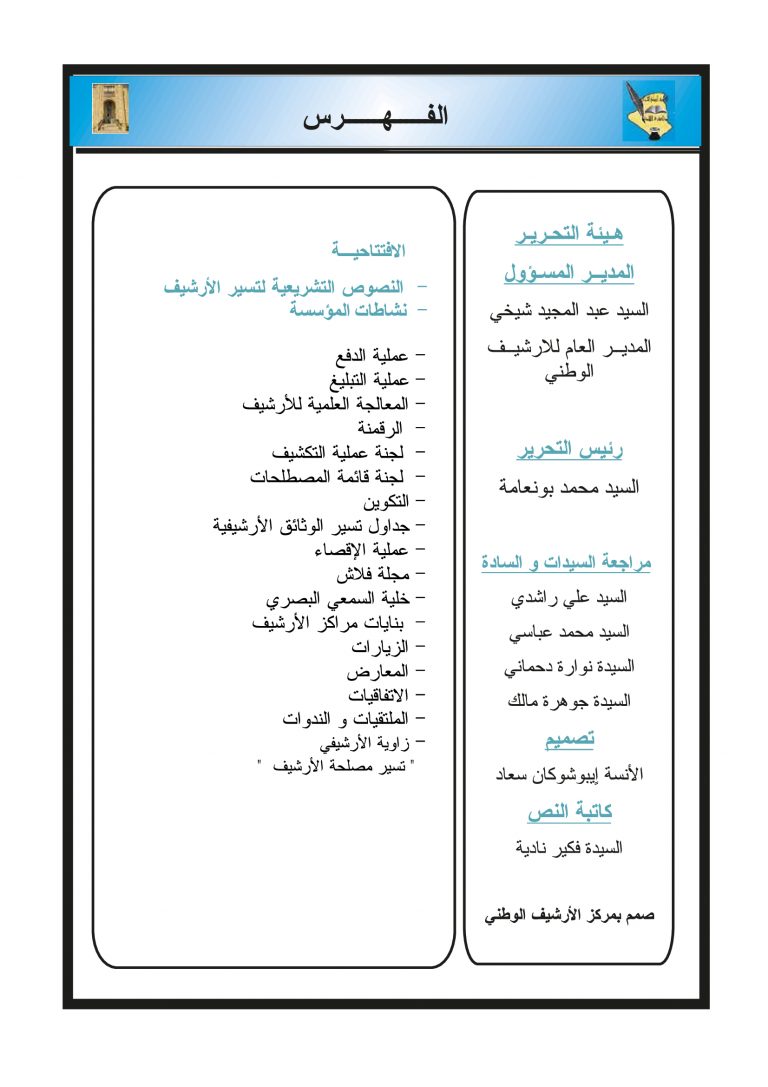 C’est une publication interne, éditée par l’Institution des Archives Nationales. Il s’agit d’un outil d’information et de formation qui rapporte les expériences et suggestions des archivistes ainsi que le métier qu’ils exercent et tout ce qui se fait au Centre des Archives Nationales et dans les centres du monde entier. Cette publication est au service des archivistes car elle répond aux questionnements techniques et organisationnels que se posent les gens du métier.